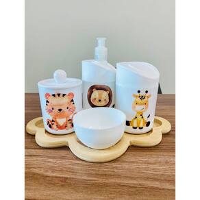 Kit Organizador para bebê c/bandeja em MDF. Cor do Pote: BRANCO PADRÃO Tampas: BRANCO MATERIAL DOS POTES: ACRÍLICO MATERIAL DA BANDEJA: MDF Kit acompanha: - 1 bandeja de madeira em MDF. - 1 porta sabonete / álcool gel - 1 molheira - 1 porta algodão - 1 porta cotonete MEDIDAS DA BANDEJA EM MDF: Diâmetro: 19,5x19 cm Altura: 5x8cm MEDIDA DOS POTES: Porta algodão/cotonete: 8x10,5 cm Porta sabonete líquido: 12x21 cm Molheira: 8x5 cm Marca: Doya Kids Ean: 7898901271765