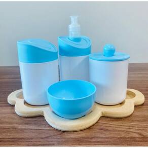 Kit Organizador para bebê c/bandeja em MDF. Cor do Pote: BRANCO PADRÃO Tampas: AZUL MATERIAL DOS POTES: ACRÍLICO MATERIAL DA BANDEJA: MDF Kit acompanha: - 1 bandeja de madeira em MDF. - 1 porta sabonete / álcool gel - 1 molheira - 1 porta algodão - 1 porta cotonete MEDIDAS DA BANDEJA EM MDF: Diâmetro: 19,5x19 cm Altura: 5x8cm MEDIDA DOS POTES: Porta algodão/cotonete: 8x10,5 cm Porta sabonete líquido: 12x21 cm Molheira: 8x5 cm Marca: Doya Kids