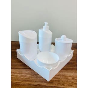 Kit Organizador para bebê c/bandeja em MDF. Cor do Pote: BRANCO PADRÃO Tampas: BRANCO MATERIAL DOS POTES: ACRÍLICO MATERIAL DA BANDEJA: MDF Kit acompanha: - 1 bandeja de madeira em MDF. - 1 porta sabonete / álcool gel - 1 molheira - 1 porta algodão - 1 porta cotonete MEDIDAS DA BANDEJA EM MDF: Diâmetro: 19,5x19 cm Altura: 5x8cm MEDIDA DOS POTES: Porta algodão/cotonete: 8x10,5 cm Porta sabonete líquido: 12x21 cm Molheira: 8x5 cm Marca: Doya Kids