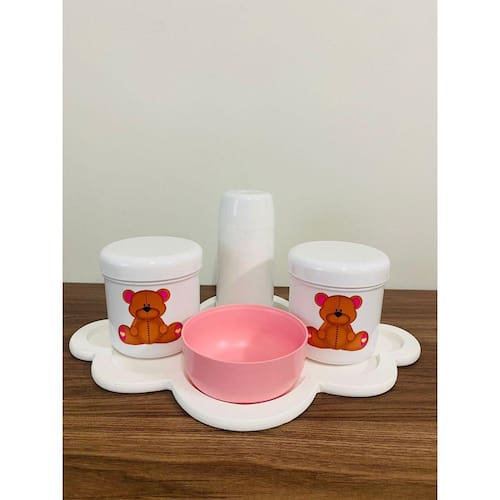 Kit Organizador para bebê c/bandeja em MDF. Cor do Pote: BRANCO PADRÃO Tampas: BRANCAS Molheira: MOLHEIRA MATERIAL DOS POTES: ACRÍLICO MATERIAL DA BANDEJA: MDF Kit acompanha: - 1 bandeja de madeira em MDF. - 1 molheira - 1 porta algodão - 1 porta cotonete - 1 garrafa térmica MEDIDAS DA BANDEJA EM MDF: Diâmetro: 41x30 cm Altura: 1,5cm MEDIDA DOS POTES: Porta algodão/cotonete: 10x14cm - CAPACIDADE: 500ml Molheira: 12,5 x 5cm GARRAFA TÉRMICA: 250ml. Conservação térmica: 4 horas quente Ean: 7898901266525