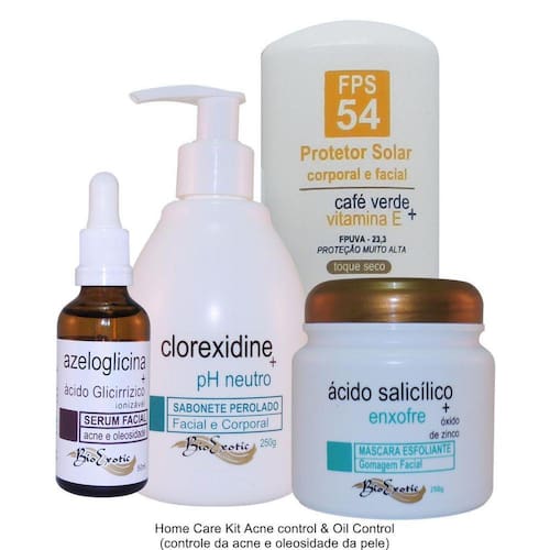 Kit Home Care Acne Control & Oil Control - Controle da Acne e Oleosidade da Pele BioexoticTratamento em casa. 1. Sabonete Ph Neutro Clorexidine - 250ml2. Máscara Esfoliante Gomagem Facial Ácido Salicílico + Enxofre + Óxido de Zinco - 250g3. Serum Facial Azeloglicina + Ácido Glicirrízico - 50ml4. Protetor Solar FPS 54 com Café Verde e Vitamina E Toque Seco - Corporal e Facial - 120gMODO DE USAR:A. lavar o rosto com o Sabonete Neutro de Clorexidine. retirar com bastante com água ou gaze umedecida em água.B. Aplicar uma fina camada da Gomagem Facial máscara esfoliante deixar agir alguns minutos deixar secar . Friccionar com a ponta dos dedos, esfregando aos poucos todas as regiões do rosto. Retirar o restante com água ou gaze umedecida em água .C. Aplicar o Serum Facial com Azeloglicina em toda face até a absorção total do produto.D. Aplicar o Protetor Solar FPS 54 em toda face para finalizar o tratamentoUsar em dias alternados 2 a 3 vezes por semana ou a critério do profissional