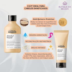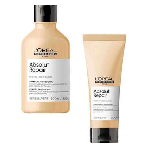 Este kit contém01 shampoo l'oréal absolut repair gold quinoa + protein 300ml01 condicionador l'oréal absolut repair gold quinoa + protein 200mlA linhaL'oréal absolut repair gold quinoa + protein é uma linha para cabelos danificados que age na reparação da superfície do fio. Isso devolve o brilho, a maciez e a leveza ao visual para que sua saúde esteja mais visível.Absolut repair é a solução definitiva para reparação instantânea sob medida para fios danificados.Indicado- cabelos danificados.- cabelos delicados.- cabelos com quebra.- cabelos ressecados.- cabelos desnutridos.- cabelos opacos.- todos os tipos de cabelos.Benefícios- reparação instantânea dos fios.- limpeza.- hidratação.- nutrição.- maciez.- brilho.- força e proteção. ShampooO shampoo l'oréal absolut repair é perfeito para o tratamento para cabelos danificados, reestrutura a fibra capilar, confere brilho e leveza.Graças a ação das proteínas vegetais de alta afinidade com proteína natural dos fios, preenche as áreas esvaziadas desde o mais profundo interior da fibra até as cutículas, formando um filme de força e proteção contra possíveis danos. CondicionadorCondicionador l'oréal absolut repair para reestruturação da fibra capilar, facilitando desembarace e devolvendo o brilho.O condicionador conta com ativos poderosos para a reconstrução dos fios, deixando seus cabelos com luminosidade e um toque sedoso incrível, e sem pesar os fios.Modo de uso ShampooAplique sobre o cabelo molhado e massageie com suavidade.Enxágue. Se necessário, repita. CondicionadorDistribua de maneira uniforme por todo o cabelo lavado e seco com uma toalha.Deixe agir de 2 a 3 min. Enxágue. DicaPara melhores resultados, use a linha completa absolut repair de l'oréal.