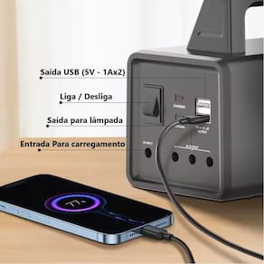 Kit Iluminação Com Painel Solar 100W 9000mAhIluminação Recarregável com Painel Solar 100W 9000mAh é a soluçãoperfeita para quem busca praticidade, potência e sustentabilidade.Com um painel solar integrado, permite o carregamento através daluz solar, tornando-a ideal para situações ao ar livre e para quemprecisa de uma fonte de iluminação independente da rede elétrica.Sua bateria de alta capacidade oferece longa duração, enquanto apotência de 100W garante uma iluminação forte e eficiente.Especificação:Marca: DPModelo: DP-7710Tipo: Lanterna Recarregável com Painel SolarPotência: 100WCapacidade da Bateria: 9000mAhSaída USB: 5V - 1A x2Saída DC: 4V - x3Potência de carregamento: 5WFator de Potência: 0.6Potência do painel solar: 5V - 3WPotência do adaptado de entrada: 100-240V 50/60Hz 0.045APotência do adaptador saída: 5V - 1ATempo de carregamento: 7 Horas (adaptador de potência: 5V - 1A)Tempo de uso: 10 á 25 Horas (Luz Led includas)Iluminação: Tecnologia LED de alta performance para uma luzintensa e de longa duraçãoFunção: Ideal para ser utilizada em acampamentos, emergências,atividades ao ar livre e em locais sem acesso à energia elétricaIndicação: Perfeita para uso em ambientes externos, acampamentos,emergências, atividades ao ar livre e como uma solução ecológicapara iluminação.