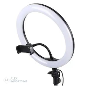 Descrição Kit contém: 1 - ring light 26cm 1 - suporte de celular abertura maxima de 8cm 1 - tripé1,60 m. 1 - controle de intensidade de iluminação - 3 tipos de tons de branco quente, frio e neutro 1 - ball head