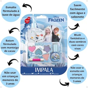 O kit é composto por um lindo esmalte que possui fórmula desenvolvida à base de água, e uma paleta de maquiagem que contém um batom super fashion, que colori os lábios e conta com propriedades hidratantes graças à sua fórmula com manteiga de cacau, um blush fantástico e duas sombras com cores vivas, que são oftalmologicamente testadas e possuem textura cremosa, de fácil aplicação e remoção. Todos os produtos são veganos, hipoalergênicos, livres de testes em animais e saem facilmente com água e sabonete. Não usar em crianças menores de 3 anos. Não usar o esmalte em crianças menores de 5 anos. Este produto não é um brinquedo.
