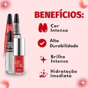 Combinação versátil de produtos: Esmalte Cremoso, Verniz Gloss, Sérum Hidratante e Lip Oil, que se complementam para um resultado impecável.