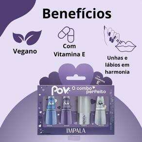Conteúdo do Kit: 2 Esmaltes (8ml cada), 1 Top Coat (8ml), 1 Gloss Labial (8ml)
