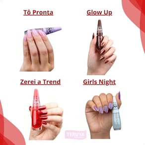 Inclui esmaltes e top coats com diferentes acabamentos, como o Zerei a Trend com efeito Glow com brilho intenso.
