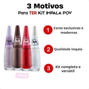O Kit Impala Pov 4 Esmaltes Top Coat, com as cores Tô Pronta, Girls Night, Zerei a Trend e Glow Up, é a solução perfeita para quem busca unhas impecáveis, brilhantes e com um acabamento profissional. Desenvolvido pela IMPALA, este kit oferece uma experiência completa para intensificar a cor do esmalte, proteger contra descamações e proporcionar muito mais durabilidade para sua manicure.