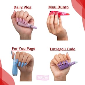 Kit contém:Kit Impala Pov 12 Esmaltes: Tô Pronta, Girls Night, For You Page, Glow Up, Zerei a Trend, Daily Vlog, Meu Dump, Arrume-se Comigo, Entregou Tudo, Clean Girl, Minha Vibe e Look Do Dia