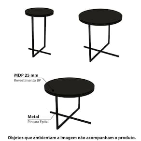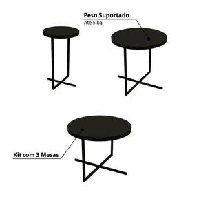 Características - Preto - Estrutura: Pés em Metal/Tampo em MDP 25 mm - Acabamento/Revestimento: Pintura Epóxi/ Pintura BP - Kit com 3 mesas - Peso Suportado: Até 5 kg - Produto entregue desmontado - Marca: Artesano