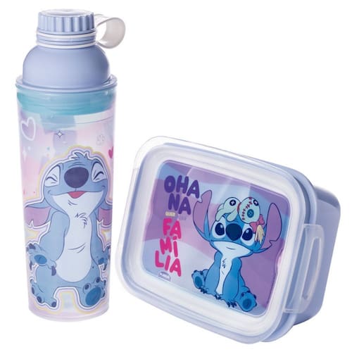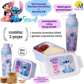 Conjunto para lanches de plástico. Conta com decoração de um dos personagens mais queridos das crianças, o Stitch. Este conjunto é composto por 1 garrafa com tampa de rosca com capacidade para 660ml e 1 pote hermético de 850ml com travas laterais e vedação de borracha. O pote conta ainda com divisória removível para melhor acomodação do alimento. O kit acompanha caixa e é ideal para presentear quem você gosta. A decoração é estampada com tecnologia intra-imagem, que garante vida longa às suas cores e desenhos. Os produtos são produzidos em material atóxico e livre de BPA em sua composição (BPA-Free), o que permite serem levados ao freezer ou ao micro-ondas com segurança total.