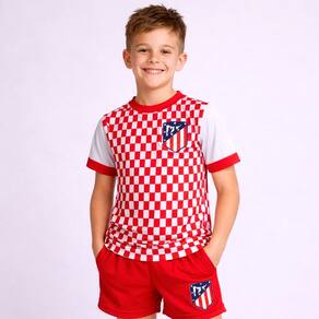 Características: - Composição: 100% Poliéster - Clube: Altético de Madrid - Escudo: Estampado - Origem: Nacional - Idade: Infantil - Manga: Curta - Gola: Careca - Bolso: Não - Forro: Não