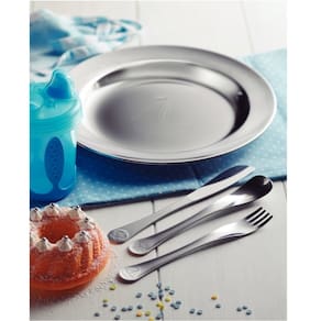 01 Jogo de Talheres Infantil em Aço Inox (01 garfo, 01 faca e 01 colher).