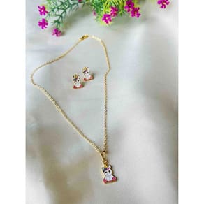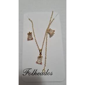 Este elegante kit infantil folheado a Ouro 18K contém um colar na cor dourada com um pingente dourado no formato de um unicórnio com 1 cm e 2 brincos em formato de unicórnio com 1 cm bijouterias feita em material com boa durabilidade e um brilho encantador. Com um design clássico e liso, é uma peça versátil que pode ser usada em diversas ocasiões, desde eventos formais até no dia a dia. Seu tamanho oferece um equilíbrio perfeito entre sutileza e magia infantil, adicionando um toque de charme e elegância ao visual da criança.