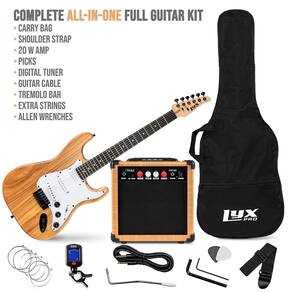 LyxPro Kit completo para iniciantes de 99 cm para guitarra elétrica tamanho completo com amplificador de 20 W, o pacote inclui todos os acessórios, afinador digital, cordas, palhetas, barra tremolo, - CONJUNTO DE GUITARRA COMPLETO | O pacote definitivo para iniciantes inclui guitarra de tamanho completo e todas as peças e equipamentos de que precisam para arrasar direto da caixa | Escolha perfeita para músicos iniciantes e intermediários - GUITARRA ELÉTRICA DE 99 POLEGADAS | Perfeita para músicos iniciantes e intermediários. Possui materiais de alta qualidade, incluindo escala de jacarandá premium, pescoço de bordo canadense, volume/tom, captadores S-S-S, puxadores e muito mais - Amplificador de 20 watts com cabo | O pacote inclui amplificador de 20 W com alto-falante embutido, entrada de fone de ouvido e entrada auxiliar para reproduzir música no telefone ou MP3 Player | Controles integrados incluem ganho, graves, agudos, volume e moagem - SINTONIZADOR DIGITAL E ACESSÓRIOS | Mini afinador de encaixe operado por bateria e livro de instruções ensina as crianças a afinar sua guitarra para melhor qualidade de som | O kit também vem com [6] cordas de aço, [2] palhetas e alça de ombro confortável - Dê o presente de uma linda música | O conjunto multifuncional para manequins é o sonho de um músico iniciante | Da casa à escola e às aulas, aprender violão nunca foi tão fácil! | Presente perfeito para Natal, aniversário e muito mais
