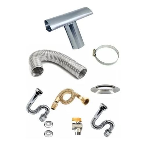 Contém 1,5m tubo chaminé, 1 chapéu T, 1 aro de arremate, 1 braçadeira 02 flexíveis de água 40cm, 01 flexível tombak 40cm e 01 registro esférico