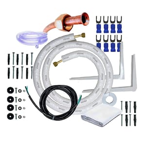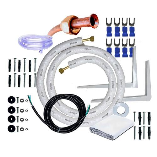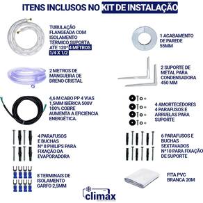 Itens inclusos: 4 metros - Tubo de Cobre flexível 1/4" já Flangeadas 4 metros - Tubo de Cobre flexível 1/2" já Flangeadas 2 porcas de 1/4" em Latão (Colocados na Tubulação) 2 porcas de 1/2" em Latão (Colocados na Tubulação 4 metros - Isolamento Térmico Blindado 1/4" 4 metros - Isolamento Térmico Blindado 1/2" 4,60 metros - Cabo PP Flexível com 4x1,5mm 20 metros - Fita de PVC branca 4 Parafusos Nº 8 Philips para a fixação da evaporadora 4 Buchas Nº 8 FU para a fixação da evaporadora 1 Acabamento de parede Ø 55mm 1 Par suporte 45 cm de metal (Compativel com Condensadora Redonda e Retangular) 4 Parafusos com porcas e arruelas do suporte 4 Amortecedores da unidade condensadora 6 Parafusos Nº 10 Sextavados para a fixação do suporte 6 Buchas nº 10 FU para a fixação do suporte 2 Metros mangueira de dreno