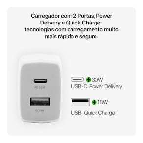 até 30 horas de reprodução de vídeo. E até 50% de recarga em 20 minutos.