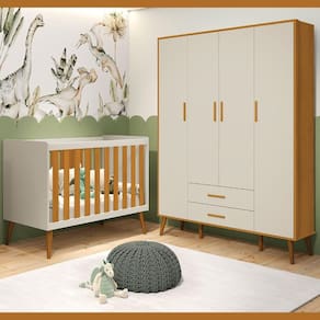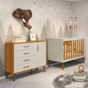 Funcional e encantadora, possui 4 gavetas com puxadores em madeira, 1 porta com prateleira interna, sistema antitombamento e amplo espaço para organizar as roupas do bebê.