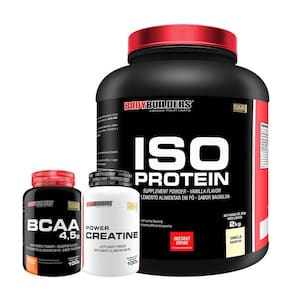 iso protein é um suplemento proteico em pó indicado para ganho de massa muscular, sua fórmula de fácil absorção é uma importante fonte de energia, além de ideal para o aumento da oferta proteica. Ingredientes: proteína isolada do soro do leite whey protein isolate , proteína isolada de soja, edulcorante sucralose e aroma. Não contém glúten. Creatine 100% é utilizado pelo tecido muscular para a produção de fosfocreatina, fator importante na formação de adenosina trifosfato atp , que funciona como um repositor de energia. Ingredientes: creatina monohidratada. Não contém glúten. Importante: a porção indicada fornece 3g de creatina. O consumo de creatina acima de 3g ao dia pode ser prejudicial à saúde. Este produto não substitui uma alimentação equilibrada e seu consumo deve ser orientado por nutricionista ou médico. Bcaa 4. 5 é indicado para ser ingerido antes e após o treino, pois fornece energia e retarda a fadiga central. Estimula a síntese de proteína muscular recuperando imediatamente os músculos danificados e prevenindo dores. A suplementação com bcaa está entre as mais importantes para qualquer programa nutricional esportivo, pois eles são indispensáveis para a manutenção e crescimento dos músculos. Ingredientes: leucina, isoleucina, valina, soro do leite em pó, antiumectante carbonato de cálcio, veículo maltodextrina e estabilizante polivinilpirrolidona. Não contém glúten. Sugestão de consumo: