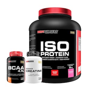 iso protein é um suplemento proteico em pó indicado para ganho de massa muscular, sua fórmula de fácil absorção é uma importante fonte de energia, além de ideal para o aumento da oferta proteica. Ingredientes: proteína isolada do soro do leite whey protein isolate , proteína isolada de soja, edulcorante sucralose e aroma. Não contém glúten. Creatine 100% é utilizado pelo tecido muscular para a produção de fosfocreatina, fator importante na formação de adenosina trifosfato atp , que funciona como um repositor de energia. Ingredientes: creatina monohidratada. Não contém glúten. Importante: a porção indicada fornece 3g de creatina. O consumo de creatina acima de 3g ao dia pode ser prejudicial à saúde. Este produto não substitui uma alimentação equilibrada e seu consumo deve ser orientado por nutricionista ou médico. Bcaa 4. 5 é indicado para ser ingerido antes e após o treino, pois fornece energia e retarda a fadiga central. Estimula a síntese de proteína muscular recuperando imediatamente os músculos danificados e prevenindo dores. A suplementação com bcaa está entre as mais importantes para qualquer programa nutricional esportivo, pois eles são indispensáveis para a manutenção e crescimento dos músculos. Ingredientes: leucina, isoleucina, valina, soro do leite em pó, antiumectante carbonato de cálcio, veículo maltodextrina e estabilizante polivinilpirrolidona. Não contém glúten. Sugestão de consumo: