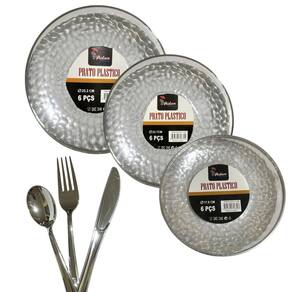 Kit Jantar 12 Pratos Acrílico Borda Prata 25Cm +36 Talheres