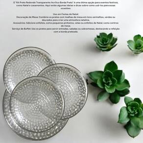 Contém: 12 unidades Pratos Refeição Redondo Transparente Acrílico Borda Prata 25,3cm