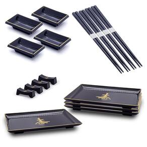 As peças desse kit possuem acabamento preto laqueado de excelente qualidade, alto brilho e pintura do ideograma em dourado que representa felicidade, trazendo todo o charme e elegância da cultura japonesa para a sua mesa. Além disso, as cores fortes inspiradoras presentes nas tradicionais decorações japonesas tornam esse conjunto ainda mais especial.