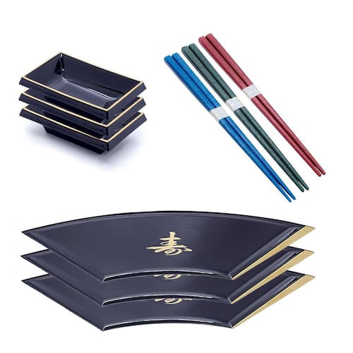 Kit japonês composto prato em formato leque com detalhes dourados e ilustração de ideograma, ideal para servir comidas japonesas, deixando a apresentação do prato muito mais requintada. Também com molheiras no qual são servidos molhos, pastas e acompanhado de hashis coloridos para melhor composição a sua mesa. - Prato Leque com acabamento preto laqueado, destaque ideograma dourado com palavra Kotobuki.