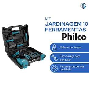 Com o Kit Jardinagem Philco PKJ10 o momento de cuidar das suas plantas e do seu jardim será mais fácil e prazeroso. Ele é composto por 10 ferramentas, perfeitas para diferentes atividades na hora de realizar a manutenção dos espaços. Acompanha maleta com travas para você guardar todos os acessórios, manter organizado e ter mais facilidade e segurança ao transportar e cuidar das suas plantinhas. As ferramentas do Kit Jardinagem são em aço e possuem cabo em plástico de alta resistência com furo na alça para pendurar, o que as torna mais leves, práticas e fáceis de serem manuseadas. O Kit Jardinagem Philco PKJ10 é ideal para quem ama jardinagem ou que deseja cuidar das suas plantas, hortas e temperos com as próprias mãos e com menos esforço físico. -acompanha 10 acessórios para atividades de jardinagem; -cabo dos acessórios em plástico de alta resistência; -acompanha maleta para armazenamento dos acessórios; -acessórios: 1 ; 1 mini rastel de 4 pontas; 1 Ancinho de 3 pontas; 1 mini pá larga; 1 mini pá estreita; 1 pá de mão estreita; 1 pá de mão larga; 1 tesoura para folhas; 1 tesoura para poda; borrifador de 170ml. -A , as pás de mão e o ancinho possuem furo na alça para pendurar. Medidas: 20cmX30cmX7cm, 1,35kg Marca: Não Informado Ean: 7891356108617