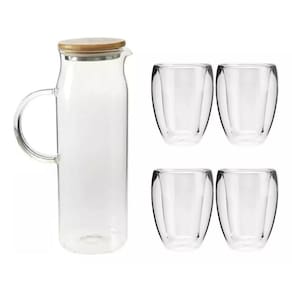 KIT Jarra De Suco Com Tampa Bambu Vidro Borossilicato 1,5 L + 04 Copos Cha Dupla Parede Barista