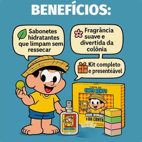 Kit Jequiti Turma do Chico Bento: Estojo com 4 Sabonetes Hidratantes em Barra 80g cada + Desodorante Colônia 25ml Descubra o encanto e a diversão com o Kit Jequiti Turma do Chico Bento, uma combinação perfeita para o cuidado diário e para perfumar com alegria. Este kit exclusivo, da renomada marca JEQUITI, foi cuidadosamente elaborado para proporcionar momentos de higiene e bem-estar, transportando a magia da Turma do Chico Bento para o seu dia a dia.