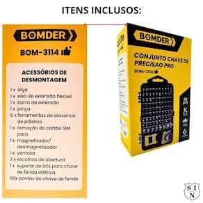 1 x alça plástico , 1 x eixo de extensão flexível, 1 x barra de extensão, 1 x pinça, 2 x ferramentas de alavanca de plástico, 1 x ferramentas de remoção de cartão sim, 1 x magnetizador/desmagnetizador, 1 x ventosa, 2 x palhetas de abertura, 1 x suporte de broca para chave de fenda elétrica, 1 x case de armazenamento transporte, 98 x bit chave de fenda Homologação Anatel: 034411407561 Marca: Bomder Ean: 7908782201666