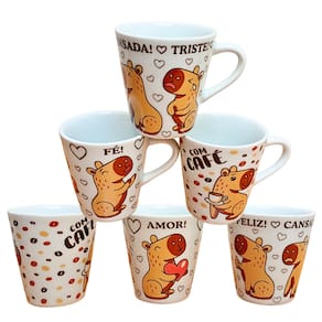 Kit Jogo 6 Canecas 120ml Capivara - Porcelana Contém 6 canecas com design bem interessante, você pode se presentear e presentear as pessoas que você gosta.Tema: Capivara Peças de porcelana feitas de material de alta qualidade, queimados em alta temperatura, o que os torna fortes, resistentes e com alto brilho, e deixa qualquer ambiente mais bonito e moderno. Decalques com queima e fixação em alta temperatura, o que dá perfeita fixação e não desbotam com o tempoA porcelana tem uma enorme vantagem sobre outros materiais, pois é fácil de limpar e não absorve cheiro, o que deixa a peça e o ambiente livre de mal cheiro.São resistentes ao micro-ondas e lava-louçasÓtimas para servir café com leite, água e bebidas em geral. Muito boas para presentear quem você ama e tornar os momentos do dia mais felizesOBS: Embalagem contem 6 unidades