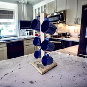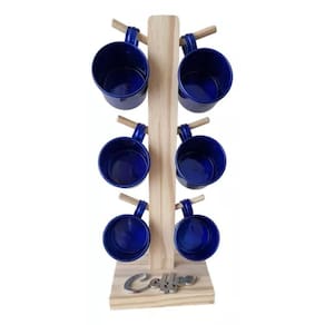 Kit Jogo 6 Xícara Azul Café Suporte Madeira Mesa Cozinha