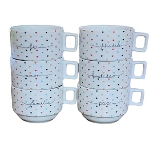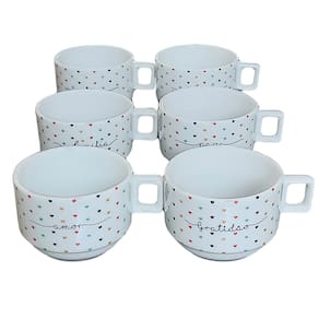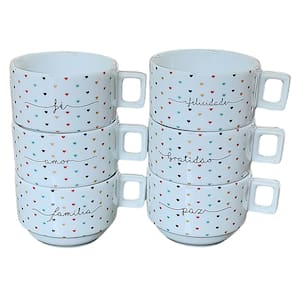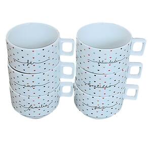 Kit Jogo 6 xícaras Café Chá 200ml Empilháveis - Porcelana decorada <<<Podem ser adquiridas em conjunto com os pires exclusivos de nossa loja>>> (Temos pires variados de pinus e porcelana) Peças de porcelana feitas de material de alta qualidade, queimados em alta temperatura, o que os torna fortes, resistentes e com alto brilho, e deixa qualquer ambiente mais bonito e moderno.A porcelana tem uma enorme vantagem sobre outros materiais, pois é fácil de limpar e não absorve cheiro, o que deixa a peça e o ambiente livre de mal cheiro. Podem ir ao forno, Microondas e lava-louçasCor: Decoração poá colorido com frases: Amor, Paz, Gratidão, Fé, Família e Felicidade. Capacidade das xícaras: 200mlSão empilháveis, o que torna o armazenamento mais prático. OBS: Pode haver variação de tonalidade entre as peças de porcelana devido a diferentes lotes de queima. Embalagem contêm 6 peças Marca: Antilope Decor Porcelanas