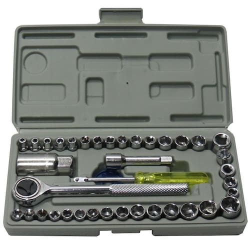 Kit Jogo Chave Catraca Reversível + Jogo De Soquete 40 Pçs + Maleta Kit de chave do tipo 40 peças Monaliza MZ-07163 1 pç: 3/8 chave reversível 14 pçs: soquetes de encaixe 4,4.5,5,5.5,6,6.5,7,7.5,8,9,10,11,13,13mm 14 pçs: soquetes de encaixe: 5/32, 3/16, 7/32, , 9/32, 5/16, 11/32, 3/8, 13/32, 7/16, 15/32,1/2,17/32,9/16 3 pçs: soquetes de encaixe BPT : , 5/16, 3/8 1 pç: 3/8 vela de ignição 21mm 1 pç: 6 punho 2 pçs: 3/8 soquetes de encaixe: 15mm 16mm 1 caixa de plástico.