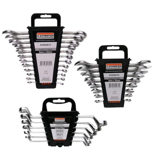 Jogo de chave combinada Starfer com 12 peças, indicada para aperto e desaperto de porcas, parafusos quadrados e sextavados.