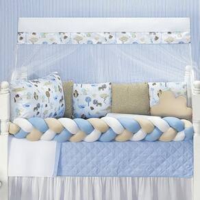 1 lençol com elástico 130cm x 70cm 10cm 1 edredom - 130cm x 70cm 1 cabeceira - 65cm x 40cm 4 protetores laterais - 32cm x 25cm 1 protetor trança - 125cm x 12cm 1 fronha branca lisa 1 almofada nuvem 1 bando mosquiteiro 1 mosquiteiro 1 saia de berço box