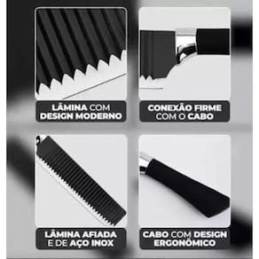 Características: - Design de lâminas para maior desempenho e durabilidade - Cabo ergonômico - Revestimento Antiaderente de Aço Inox - Tesoura com multi funções: Corte, Abre garrafas, quebra nozes - Cortador de Legumes e Frutas com lâmina de cerâmica
