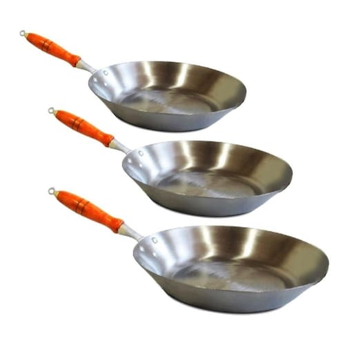 01 Kit Jogo Frigideiras Aço Carbono Chapa 1mm Cabo de Madeira 25,30 e 35cm.