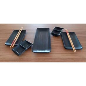 Esse Kit é composto por : - 2 Pratos retangulares de 18 x 11 cm - 2 Molheiras duplas de 12 x 8 cm - 2 pares de Hashis de bambú - 1 Travessas retangulares de 27,5 x 11,5 cm