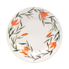 As bordas de cada borda e pires recebem o desenho feito à mão da flor de cor laranja junto de ramos e folhas. As cores são vibrantes e trazem alegria à mesa. A xícara é esmaltada em laranja.