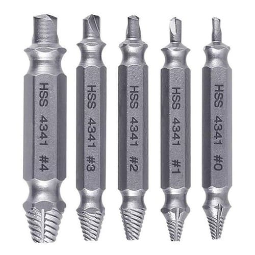 4. Tamanhos e tipos diferentes, este conjunto removedor de parafuso, em si vem com cinco brocas de tamanho diferentes. Dois lados podem ser usados. Assim pode ser usado em todos os tipos e tamanhos de parafuso.