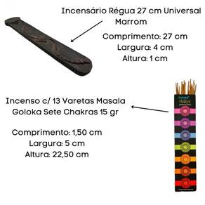 Incenso 13 Varetas Tamanho da Caixa: 1,50 x 5,00 x 22,50 cm Peso aproximado: 26 g Contém: 1 Caixas de Incensos Varetas Sete Chakras com 13 Incensos varetas na caixinha.