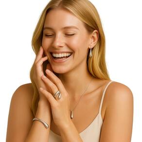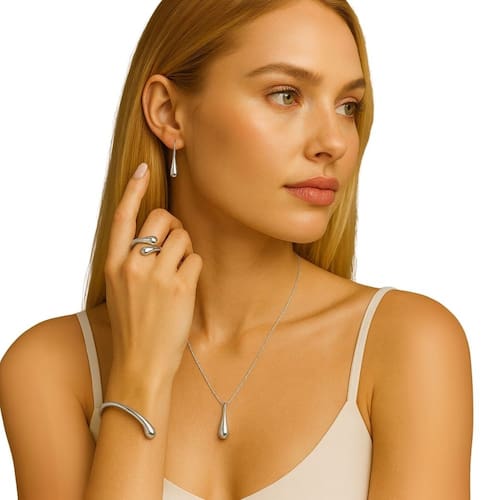 Beleza e sofisticação em um conjunto completo. Este kit de joias femininas prateadas é composto por 4 peças com design moderno e elegante em formato de gota. O acabamento em prata traz brilho discreto e versatilidade para compor desde looks casuais até produções mais refinadas.