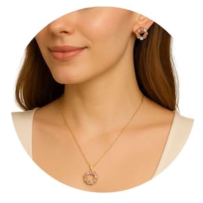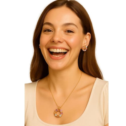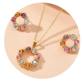 Um conjunto moderno e vibrante para realçar qualquer produção. Este kit de joias femininas é composto por um colar com pingente circular e um par de brincos, todos com pedras coloridas em tons de rosa, lilás, âmbar e cristal. As pedras têm brilho intenso e são cuidadosamente fixadas em uma base dourada de acabamento refinado.