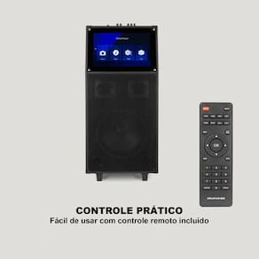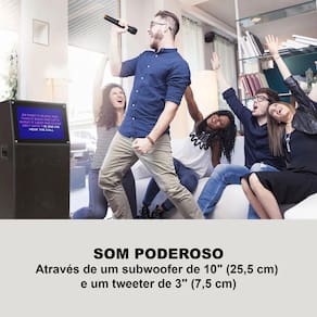 Com a ajuda da interface WiFi integrada e do display touch de 12,1" (30,5 cm), numerosas aplicações de browser e de Apps podem ser reproduzidas tanto visual como audivelmente através do sistema de karaoke KTV M da auna. Isto torna o dispositivo perfeito para reproduzir vídeos do YouTube, com seleção das faixas em Spotify e também para a leitura das letras. O potente subwoofer de 10" (25,5 cm) emite graves que se precipitam sob a pele, enquanto o tweeter de 3" (7,5 cm) arredonda o som. Uma variedade de opções de conexões proporciona o som desejado: quer através de ligação Bluetooth a partir de smartphone, tablet ou leitor de MP3, através de 2 portas USB, slot SD ou micro SD, bem como através de cabo HDMI. Uma saída AUX também encaminha o sinal áudio para outros dispositivos áudio HiFi, tais como sistemas stereo. Naturalmente, a entrada do microfone também pode ser utilizada para uma guitarra eléctrica. Os dois microfones de rádio UHF sem fios asseguram desempenhos de karaoke quentes, atuações vocais estimulantes e moderações: sem fios, brilham com uma transmissão sem interferências - perfeitos para aquecer realmente qualquer audiência. O sistema de karaoke KTV M da auna está também idealmente equipado para utilização móvel em eventos: a estrutura robusta suporta muitas cargas, enquanto que a pega do trolley extensível permite que até os DJs altos transportem o sistema confortavelmente. Uma potente bateria recarregável de 12 V / 4,5 mAh proporciona 3 a 5 horas de funcionamento contínuo, enquanto o cabo de rede fornecido permite uma fácil ligação à rede. Um comando de controlo remoto completo permite o controlo mesmo a alguma distância.
