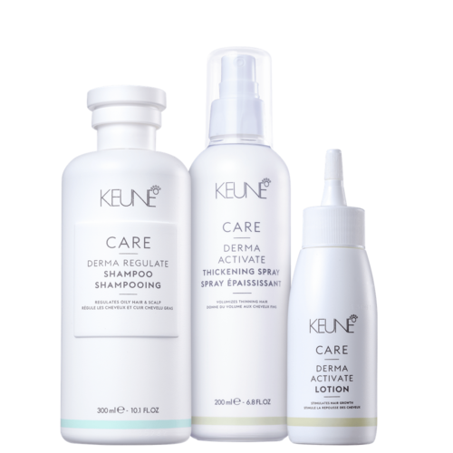Kit de tratamento para cabelos finos, oleosos, com queda ou ralos. Keune Care Derma Activate Regulate Trio regula a oleosidade e fortalece os fios.